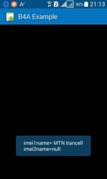 ToastMessageShow(" imei1name= "&prim.Sim1NetworkOperatorName & CRLF& " imei2name="&prim.Sim2NetworkOperatorName,False)