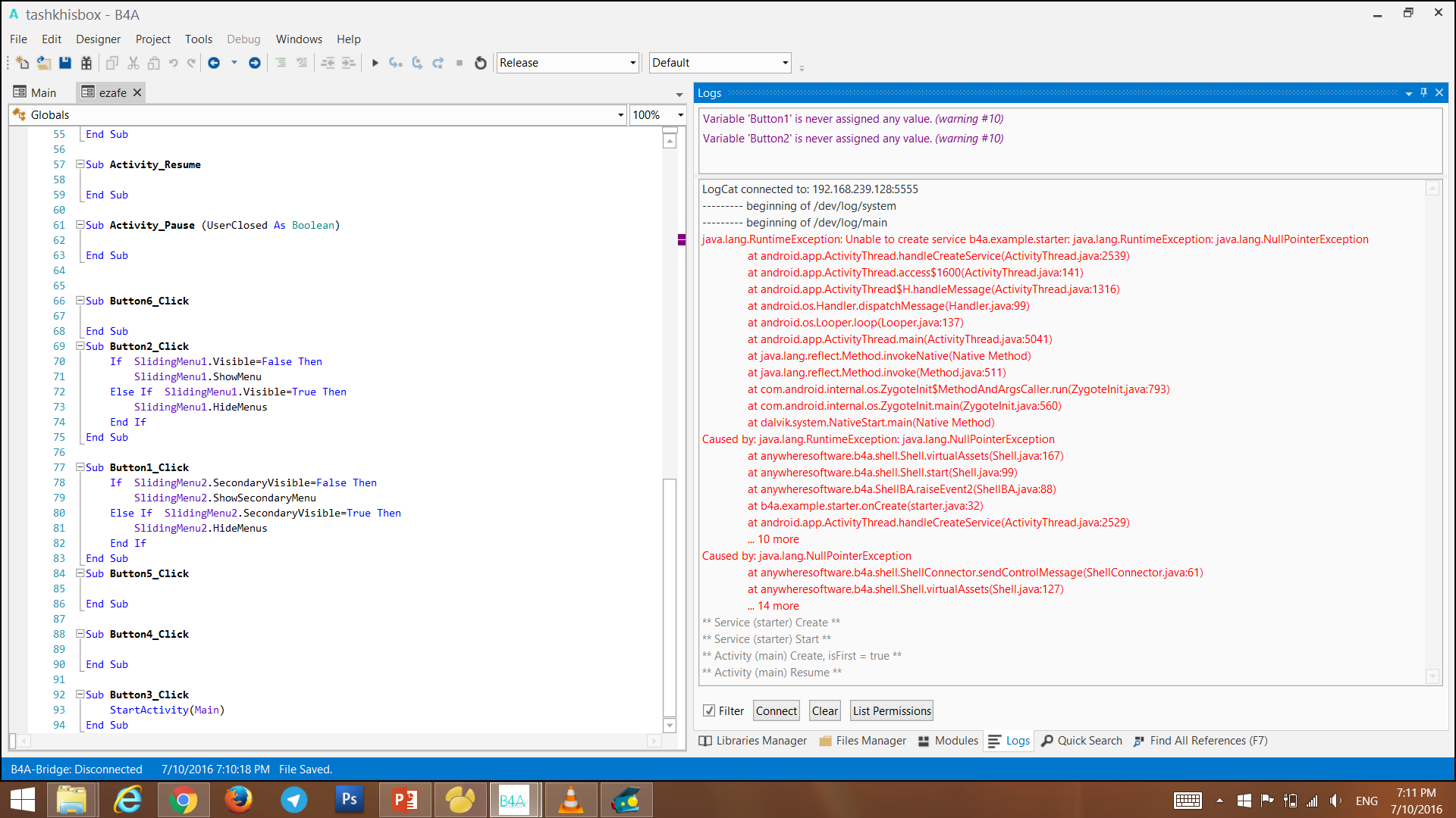 Sub Button7_Click Panel1.Visible = False a = DateTime.Time(DateTime.Now) d = DateTime.Date(DateTime.Now) sql.ExecNonQuery("INSERT INTO tb1 (Id,name,ghad,d1,d2) VALUES (null,'"&EditText1.Text&"','"&EditText2.Text&"','"&a&"','"&d&"')") End Subلینک ارسال