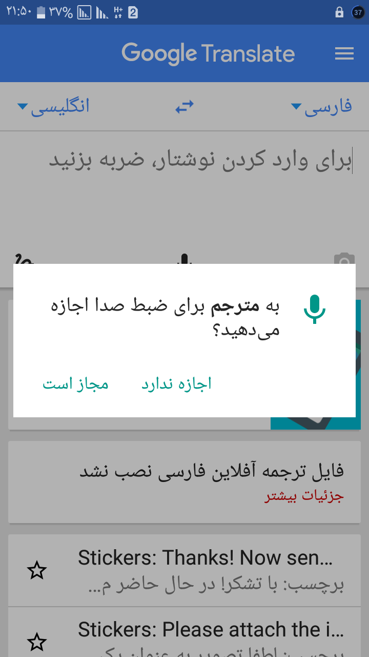 صدایی ضبط و ارسال کنیم ابتدا پنجره ای کوچک باز می شود و باید کاربر به مترجم گوگل مجوز ضبط صدا را بدهد بعد صدا راضبط و ارسال .
