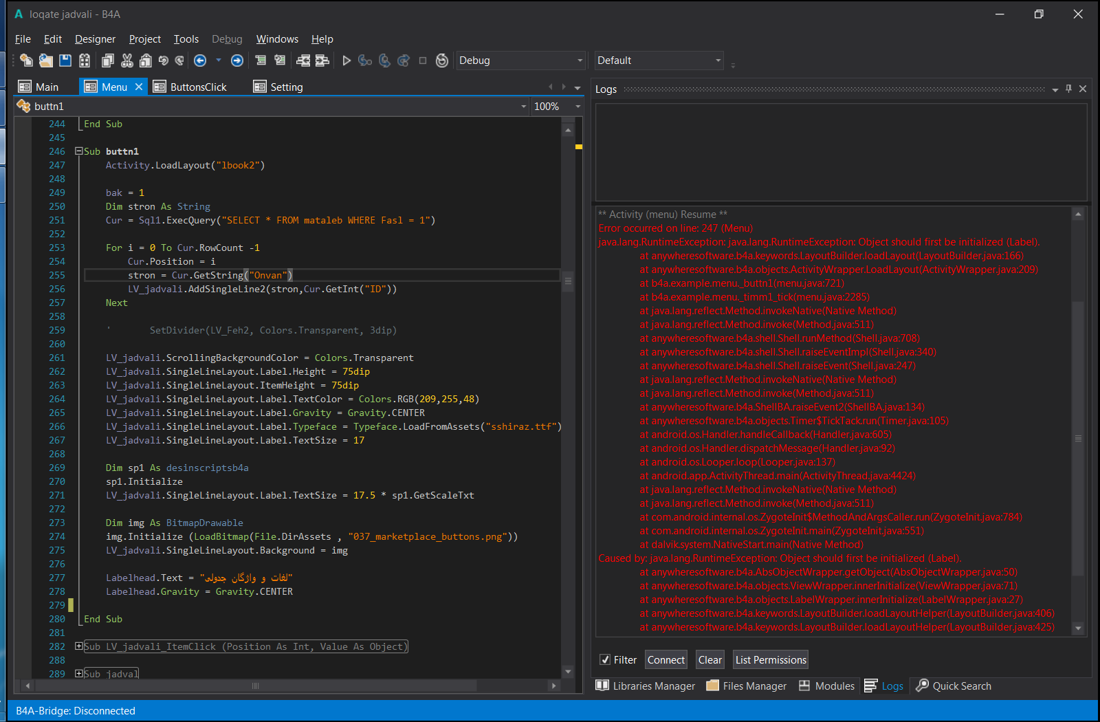 دانشجو 39 ارسال شده در 1 خرداد، 2017 اشتراک گذاری ارسال شده در 1 خرداد، 2017 توی خطا میگه که شما یک Label دارید که Initialize نکردید این حالت به دو صورت رخ میده، اول اینکه شما لیبل رو با کد نویسی اضافه کردین ولی Initialize نکردین، دوم اینکه لیبل رو از طریق دیزاینر ساختید، اما اون لایه ای که لیبل درونش هست رو LoadLayout نکردید و زمانیکه بخوایید به لیبل متنی اضافه کنید و یا هرکاری انجام بدید این خطا رو میده. لینک ارسال به اشتراک گذاری در سایت های دیگر تنظیمات بیشتر اشتراک گذاری ...