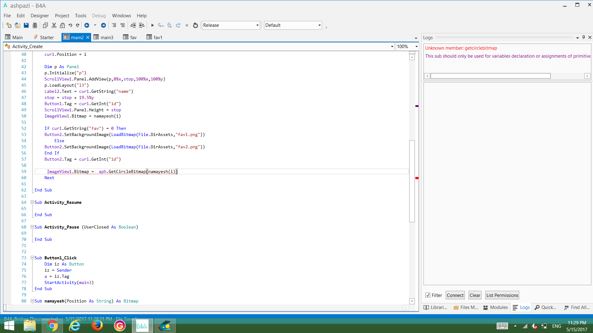 محمد رشوند 1,208 ارسال شده در 15 مرداد، 2017 اشتراک گذاری ارسال شده در 15 مرداد، 2017 در 1 ساعت قبل، Mohammad.1379 گفته است : این خط رو ارور میده مگه namayesh(i) رو در پایین از نوع بیت مپ نساختید؟؟ خب پارامتر ورودی aph.GetCircleBitmap از نوع بیت مپ هستش ارور رو قرار بدید لینک ارسال به اشتراک گذاری در سایت های دیگر تنظیمات بیشتر اشتراک گذاری ...