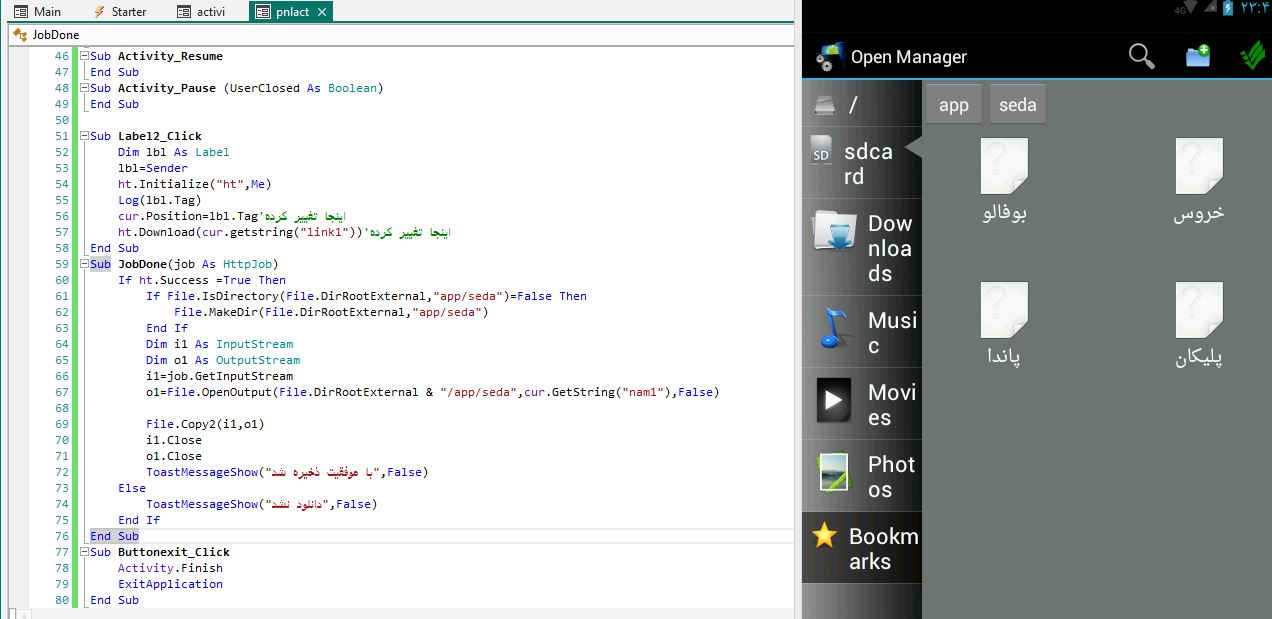 Sub Process_Globals Dim sql1 As SQL Dim cur As Cursor End Sub Sub Globals Private ScrollView1 As ScrollView Private Panel1 As Panel Dim top As Int=2%y Private Label1 As Label Private Label2 As Label Dim hight As Int Dim su As StringUtils Dim ht As HttpJob Private Buttonexit As Button End Sub Sub Activity_Create(FirstTime As Boolean) 'Do not forget to load the layout file created with the visual designer. For example: Activity.LoadLayout("scpnl") File.Copy(File.DirAssets,"hefdah.db",File.DirInternal,"hefdah.db") sql1.Initialize(File.DirInternal,"hefdah.db",False) cur=sql1.ExecQuery("SELECT * FROM st") For i=0 To cur.RowCount-1 cur.Position=i Dim p As Panel p.Initialize("p") ScrollView1.Panel.AddView(p,2%x,top,95%x,85%y) p.LoadLayout("pnlpnl") Label2.Color=Colors.DarkGray Label1.Color=Colors.DarkGray Label1.Text=cur.GetString("matn1") hight=su.MeasureMultilineTextHeight(Label1,cur.GetString("matn1"))+15%y Label2.Text="دریافت صوت" p.Height=hight+10dip top=top+hight ScrollView1.Panel.Height=top Label1.Gravity=Gravity.CENTER Label2.Gravity=Gravity.CENTER Label2.tag =cur.getstring("link1")' تگ لیبل 2 Next End Sub Sub Activity_Resume End Sub Sub Activity_Pause (UserClosed As Boolean) End Sub Sub Label2_Click Dim lbl As Label lbl=Sender ht.Initialize("ht",Me) Log(lbl.Tag) ht.Download(lbl.Tag) End Sub Sub JobDone(job As HttpJob) If ht.Success =True Then If File.IsDirectory(File.DirRootExternal,"app/seda")=False Then File.MakeDir(File.DirRootExternal,"app/seda") End If Dim i1 As InputStream Dim o1 As OutputStream i1=job.GetInputStream o1=File.OpenOutput(File.DirRootExternal & "/app/seda",cur.GetString("nam1"),False) File.Copy2(i1,o1) i1.Close o1.Close ToastMessageShow("با موفقیت ذخیره شد",False) Else ToastMessageShow("دانلود نشد",False) End If End Sub Sub Buttonexit_Click Activity.Finish ExitApplication End Subمن اینها را قبلا توی پست دیگه مطرح کردم منتها یکی از دوستان (mr mrdia)گفت که باید تایپیک بزنم و سوالم را مطرح کنم و کدها را بذارم
